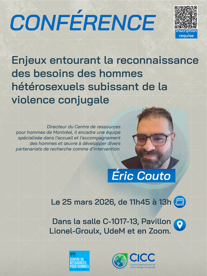 This lecture presents the findings of a doctoral research project examining the needs of heterosexual men who experience intimate partner violence, from both their own perspectives and those of professionals likely to intervene with them. More specifically, the presentation seeks to delineate the phenomenon, discuss the identification of male victims, and explore men’s self-identification as victims of intimate partner violence. The lecture also examines men’s responses to the violence they experience in order to analyze the challenges that male victimization poses for research, psycho-social and judicial intervention, and public policy.