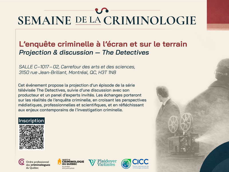 Cet événement propose la projection d’un épisode de la série télévisée The Detectives, suivie d’une discussion avec son producteur et un panel d’experts invités. Les échanges porteront sur les réalités de l’enquête criminelle, en croisant les perspectives médiatiques, professionnelles et scientifiques, et en réfléchissant aux enjeux contemporains de l’investigation criminelle.