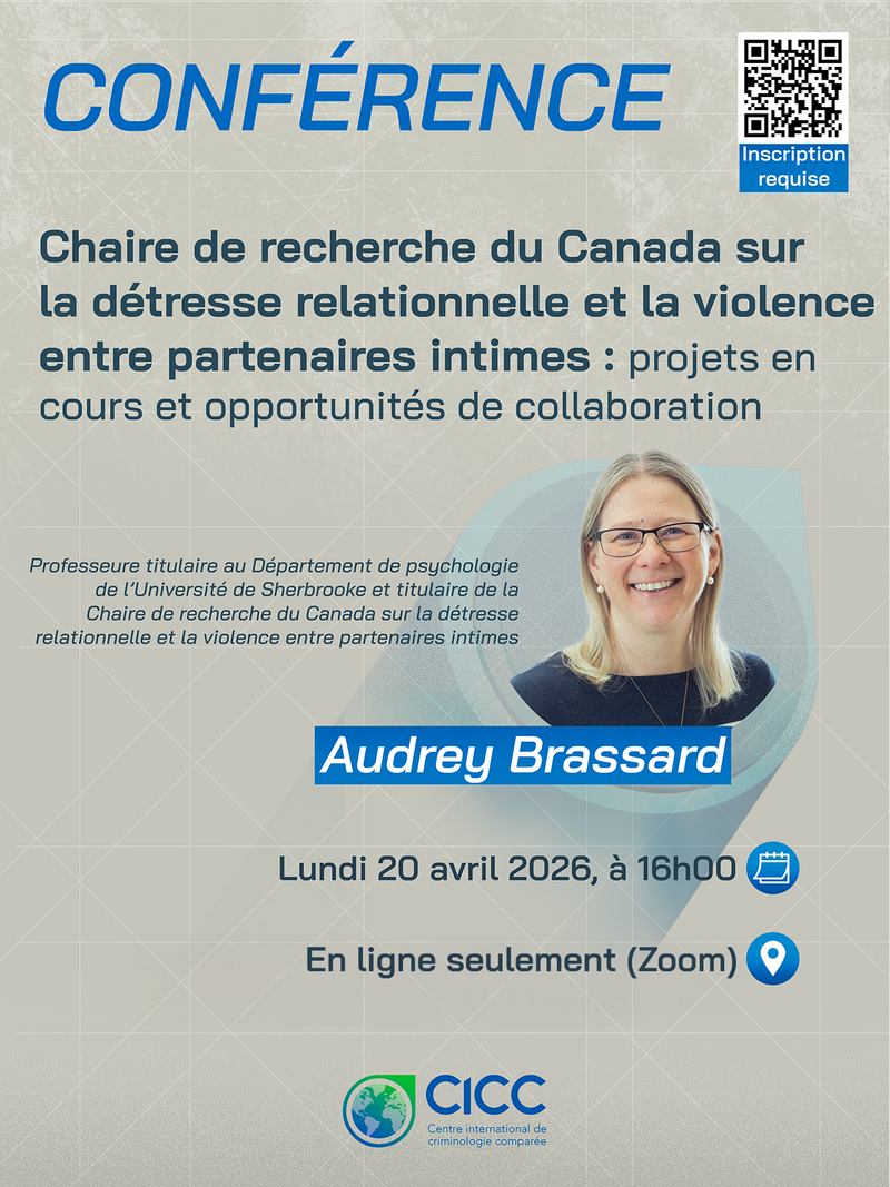 La Chaire de recherche du Canada sur la détresse relationnelle et la violence entre partenaires intimes a pour objectif de comprendre, prévenir et réduire la détresse relationnelle ainsi que la violence entre partenaires intimes (VPI). Ce programme de recherche repose sur des cadres théoriques solides et des méthodes innovantes, incluant l’accès à des riches données auprès d’individus et de couples. En s’appuyant sur une collaboration étroite avec de nombreux organismes partenaires, la CRC poursuit deux axes de recherche. Le premier axe porte sur les facteurs de risque et de protection de la détresse relationnelle et de la VPI. Le deuxième axe a pour but d’évaluer et d’améliorer les programmes de prévention et d’intervention en matière de détresse relationnelle et de VPI. La conférence permettra de présenter les résultats des projets réalisés et d’annoncer les projets en cours dans chacun des axes, puis d’échanger sur les possibilités de collaboration avec des membres du CICC.